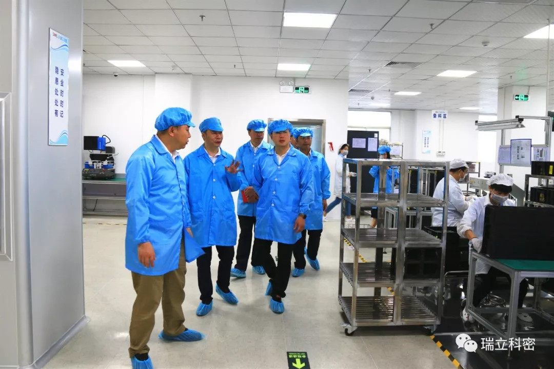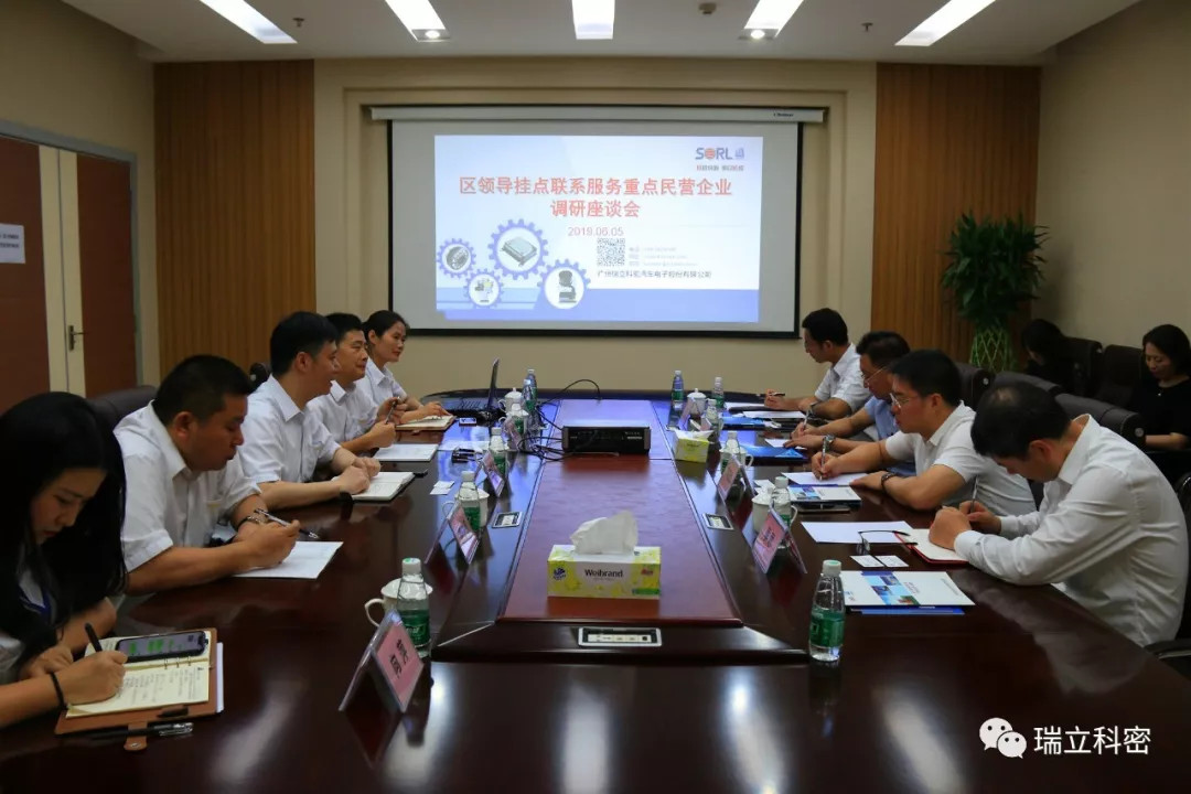 6月5日,广州市黄埔区区委常委黄晓峰、统战部副部长工商联党组书记王伟雄、工信局副局长吴火华、区科技局党委副书记季思等领导莅临广州瑞立科密进行工作调研。公司总经理黄万义、副总龙元香、燕少德等领导热情接待了区领导一行。