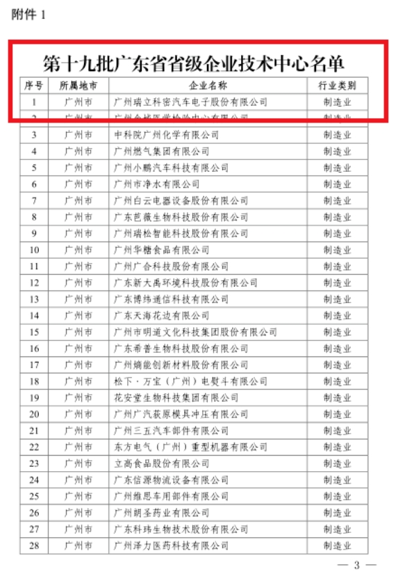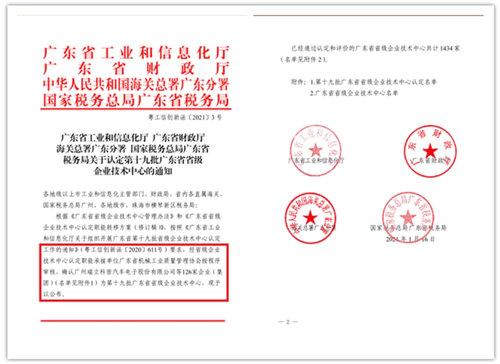 局联合颁发了《关于认定第十九批广东省省级企业技术中心的通知》,确认广州瑞立科密汽车电子